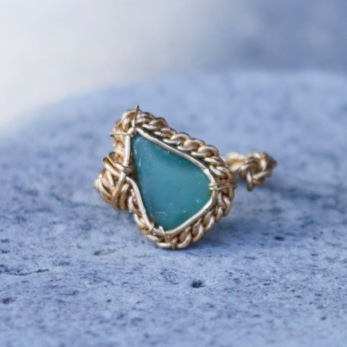 このリングは、シーグラスの持つナチュラルな「しずく型」の美しさを活かし、