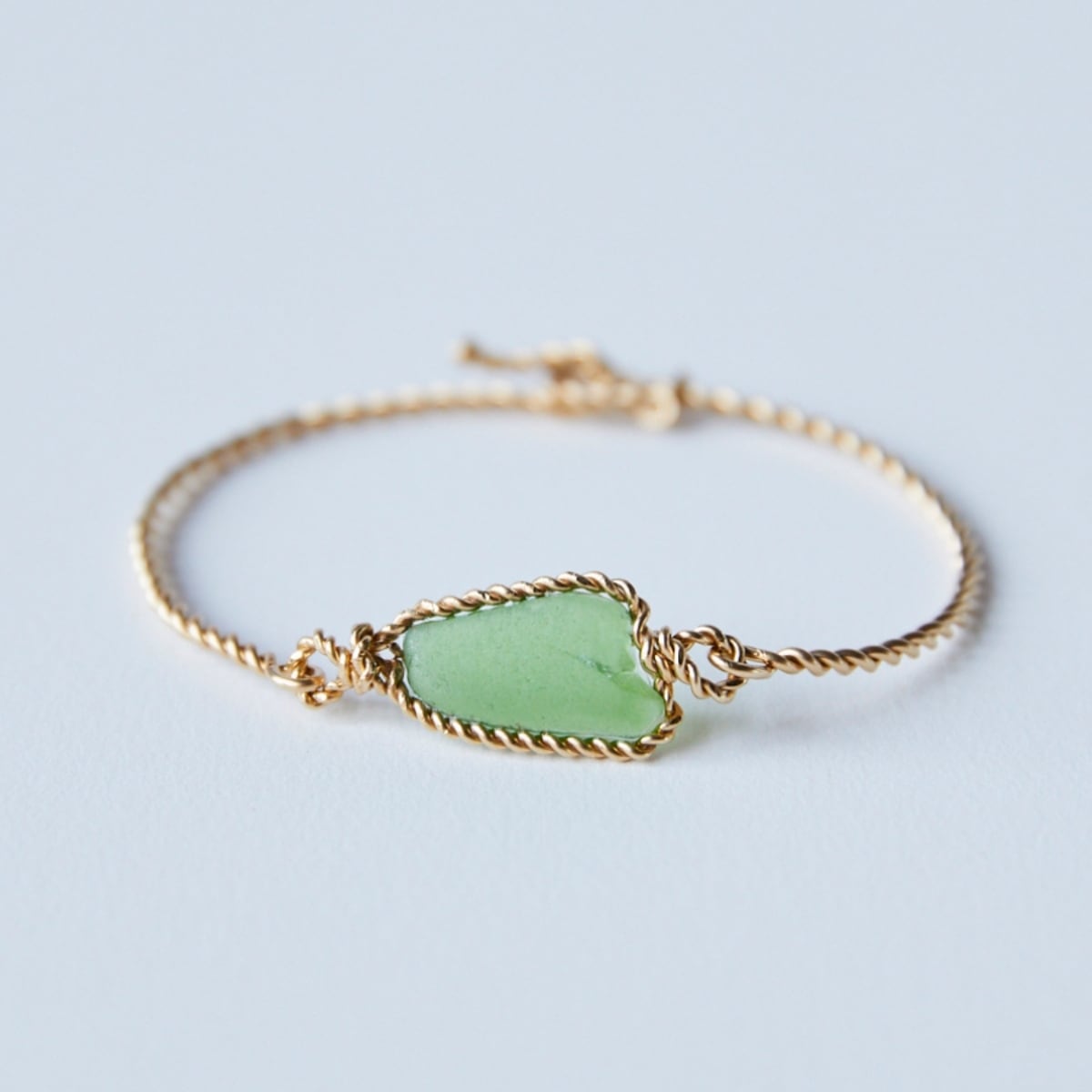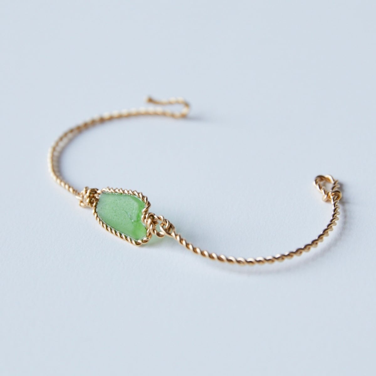 やさしいグリーンのシーグラスを、14kgfのねじりワイヤーで繊細に仕立てたブレスレットです。