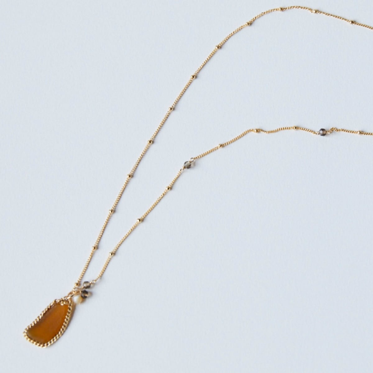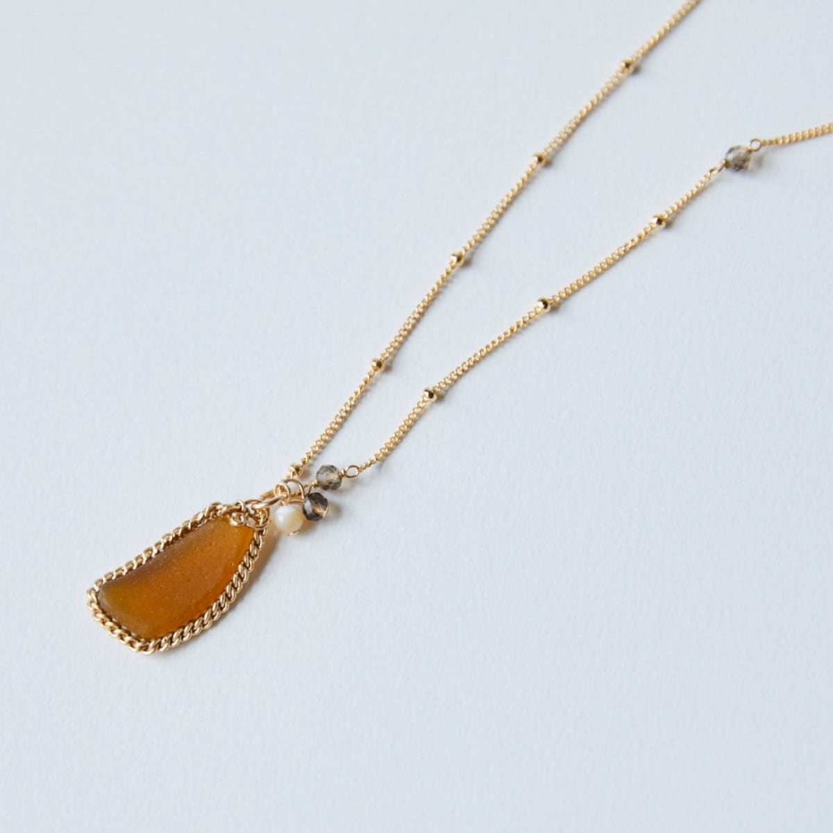 深みのあるブラウンカラーのシーグラスに、落ち着いた輝きのスモーキークォーツ、